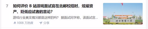 B站又“出圈”了。这次不是什么好消息,据说在北邮大学招聘时候“面试官炫耀资产、贬低应试者”,被学生怼上了知乎热搜。