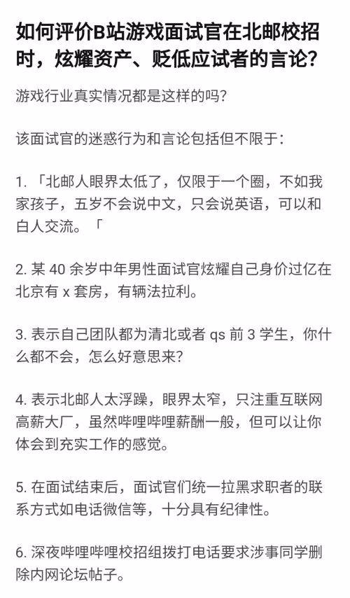 这几天,网传B站游戏部门到北京邮电大学招聘,有面试官说出了一系列令人迷惑的言论。此事在北邮内部的论坛上发酵,并在一些招聘平台、问答社区流传。