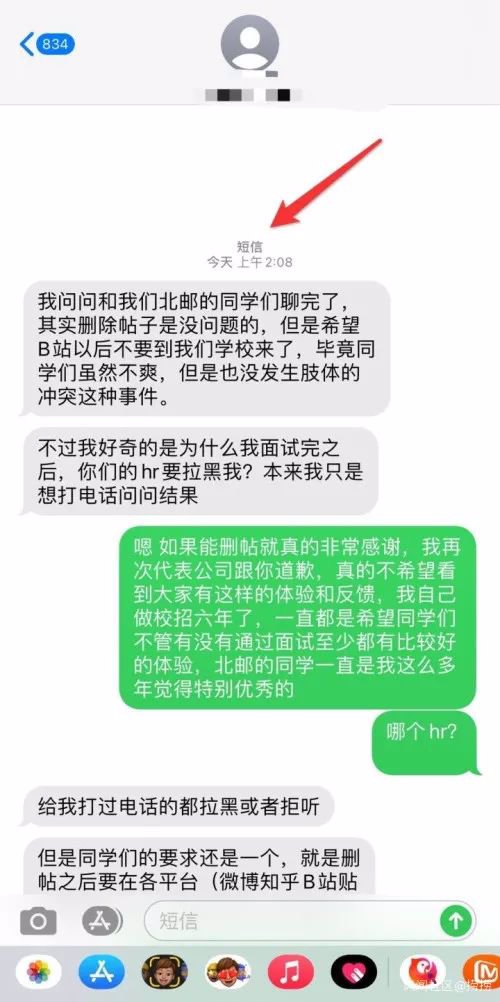 这是2点的时候,通话后该学生主动跟HR发来的短信,电话中并没有提删帖,学生自己主动提及的删帖。后来我们这段聊天被部分截取放到了网上,看上去像是HR要求他删帖。