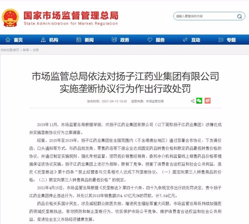 在天药股份收到罚单之前,4月15日,扬子江药业因实施垄断协议行为,被国家市场监管总局处以其2018年销售额254.67亿元3%的罚款,计7.64亿元。