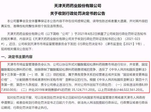 因此,天津市市场监督管理委员会决定没收天药股份违法所得889多万元,并处2019年度销售额4%的罚款 3512多万元,以上罚没款合计4402多万元。