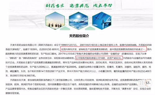 据公司官网介绍,天药股份成立于1999年12月1日,前身是天津制药厂,公司现有控股和参股公司16家,总资产43亿元。天药股份在国内开发、研制和生产皮质激素类原料药,是国内皮质激素原料药科研、生产和出口基地之一。