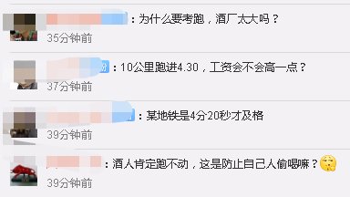 据悉,茅台将以笔试成绩从高分至低分对各通道各岗位应聘者分别进行排序,确定入围体能测试人员。体能测试项目为男子1000米跑、女子800米跑,成绩4分30秒以内判定为合格。