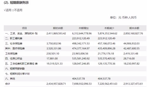 具体来看,贵州茅台短期薪酬包括工资、奖金、津贴和补贴,职工福利费,社会保险费,住房公积金、工会经费和职工教育经费、短期带薪缺勤、短期利润分享计划等多项组成。