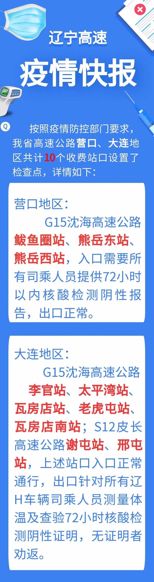 (二)大连地区:G15沈海高速公路李官站、太平湾站、瓦房店站、老虎屯站、瓦房店南站;S12皮长高速公路谢屯站、邢屯站,上述站口入口正常通行,出口针对所有辽H车辆司乘人员测量体温及查验72小时核酸检测阴性证明,无证明者劝返。