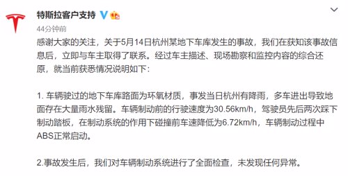 据“特斯拉客户支持”官方微博通报,关于5月14日杭州某地下车库发生的事故,我们在获知该事故信息后,立即与车主取得了联系。经过车主描述、现场勘察和监控内容的综合还原,就当前获悉情况说明如下:
