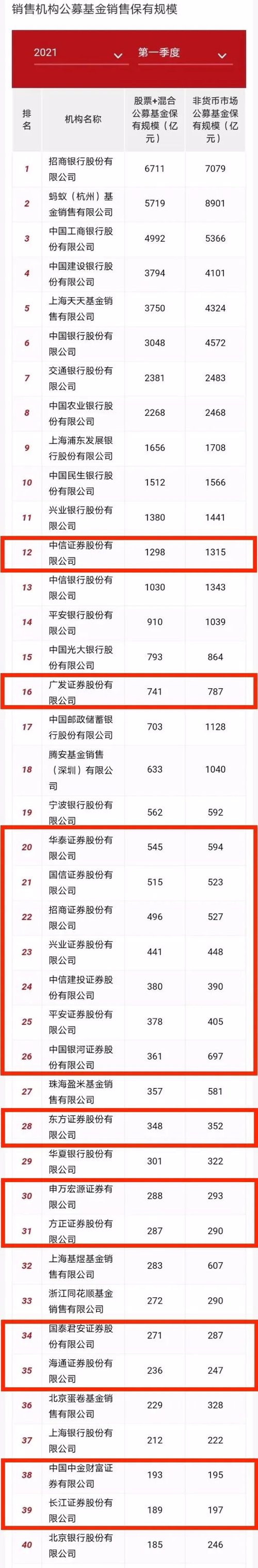 近期,中基协公布2021年一季度代销机构的公募基金保有量规模前100强榜单,券商、银行、第三方独立销售机构等各类机构中,券商数量占据近半壁江山,引发关注。