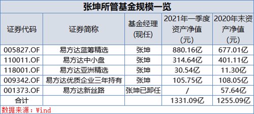 一季末张坤管理规模超1300亿