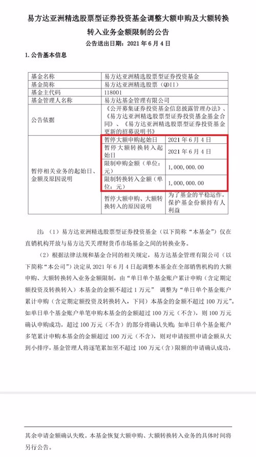 6月3日,易方达基金发布易方达亚洲精选股票基金调整大额申购及大额转换转入业务金额限制的公告。公告中称,自2021 年 6 月 4 日起,调整易方达亚洲精选基金在全部销售机构的大额申购、大额转换转入业务金额限制,由“单日单个基金账户累计申购(含定期定额投资及转换转入)金额不超过 1 万元” 调整为“单日单个基金账户累计申购(含定期定额投资及转换转入,下同)金额不超过 100 万元”。