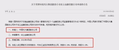 中国光大集团股份公司申请事项设立金融控股公司的受理日期为2021年6月4日,发起人或主要股东及所持股份分别为中央汇金投资有限责任公司持股63.16%;财政部持股33.43%。