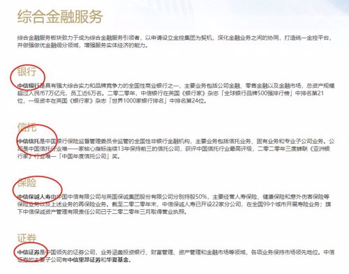 中国中信有限旗下,则有中信银行、中信证券、中信信托、中信保诚人寿等。已经上市的中信银行、中信证券2021年一季度末的总资产分别为7.79万亿元和1.15万亿元,合计其实已达8.94万亿余元;而中信信托2019年底有1.57万亿信托资产,加起来就有10.51万亿元。