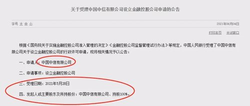 刚刚,央行官网发布,中国中信有限公司、中国光大集团股份公司设立金融控股公司的申请获得了受理!