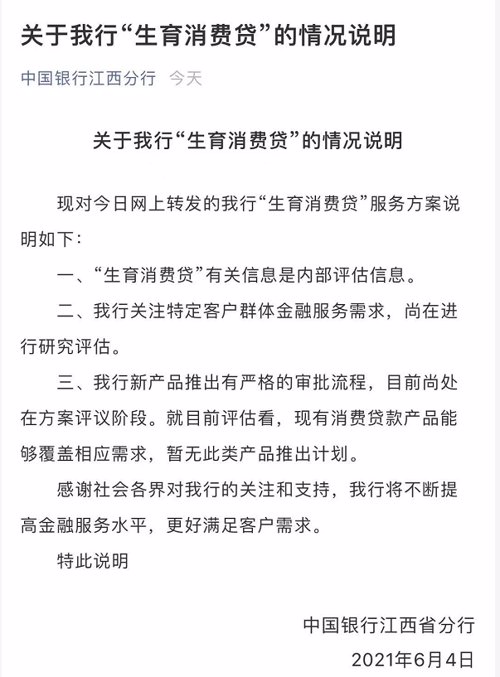 4日晚间,中国银行江西分行微信公众号发情况说明称,“生育消费贷”有关信息是内部评估信息,尚在进行研究评估。目前尚处在方案评议阶段,就目前评估看,现有消费贷款产品能够覆盖相应需求,暂无此类产品推出计划。