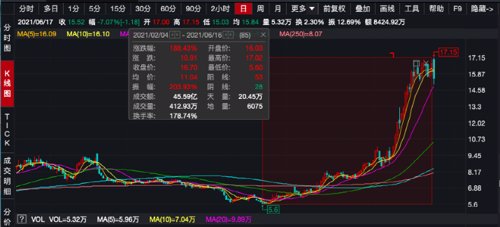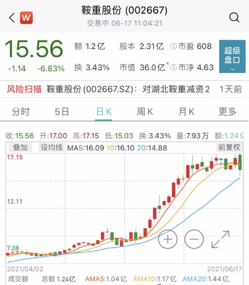 一个多月前,强强投资拟溢价超过75%的价格接盘公司1632万股股份。受此消息刺激,鞍重股份开启大涨模式,股价已从今年2月低点每股5.6元,一路上涨,累计涨幅高达188.34%。