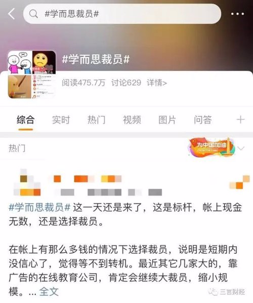 有知乎匿名用户6月16日表示:“今天傍晚接到电话,果然要被裁了……难过,心疼我的房租。”还有匿名用户表示:“有幸被开,应届毕业生没签三方,公司给了点补偿。算是我自己眼瞎了吧,转行了,课外辅导行业再见。”该用户还提到:“对不起我为学而思放弃的其他三份offer。”