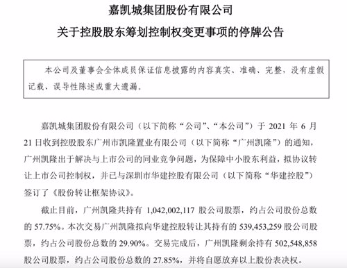 转让控制权,嘉凯城临时停牌