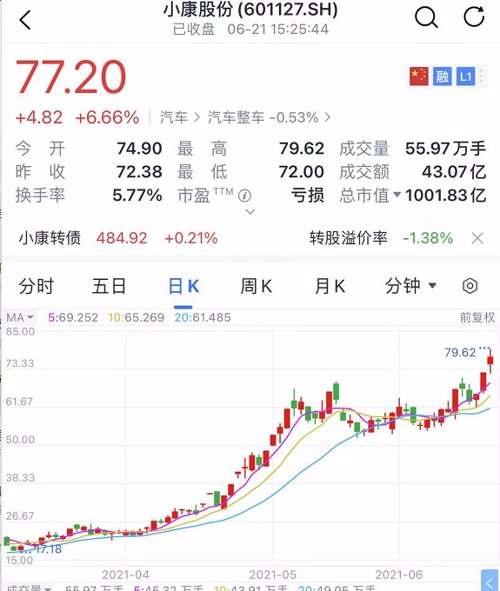 21日消息,小康股盘中涨幅一度涨超9%,总市值突破1000亿元,股价、市值双双创新高。早在年初,小康股份的股价还在12元左右的低谷徘徊。到如今,股价涨幅之高令人惊叹。