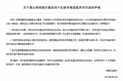 6月21日消息,中国农业银行网站发布公告称,为进一步贯彻国务院金融委会议精神,严格落实《关于防范代币发行融资风险的公告》《关于防范虚拟货币交易炒作风险的公告》等规定,按照近日人民银行有关部门约谈指导要求,其将持续开展对虚拟货币交易的打击治理行动。