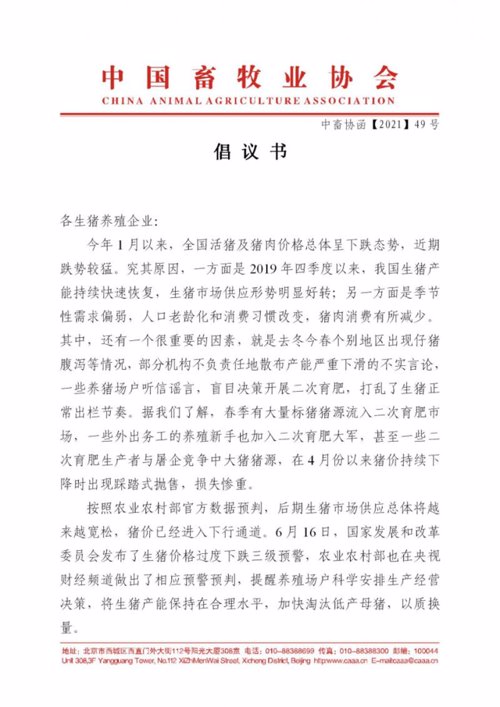 倡议书称,市场的力量是强大的。希望大家多关注农业农村部官网发布的生猪生产和市场数据,按照正常生产计划有序出栏,在价格下行阶段不要恐慌,更不要听信谣言,以赌博心态安排生产。