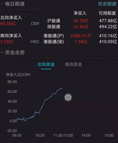 截至午盘,北向资金净流入65.35亿元,其中,沪股通净流入40.78亿元,深股通净流入24.56亿元。