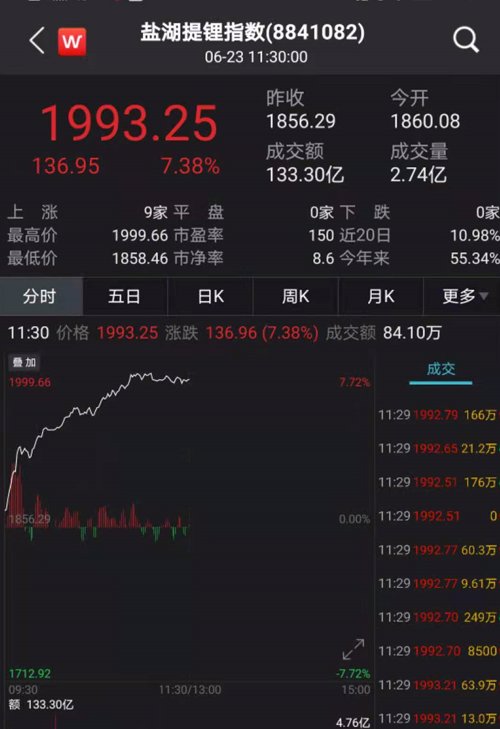 其中,盐湖提锂板块大涨超7%,位居A股首位。成交额133.3亿元。