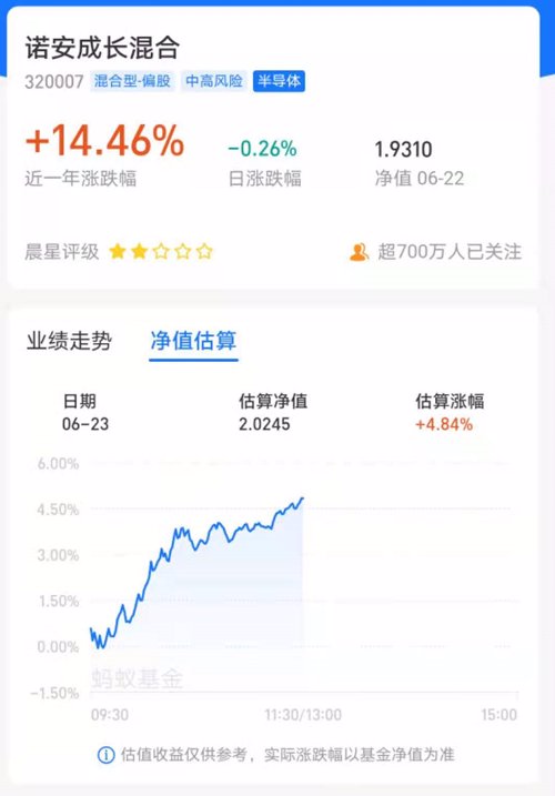 在半导体大涨下,诺安成长混合日内估算涨幅已近5%。