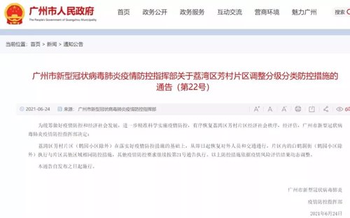今天(6月24日)下午2点,广州市新型冠状病毒肺炎疫情防控指挥部发布“关于荔湾区芳村片区调整分级分类防控措施的通告(第22号)”。
