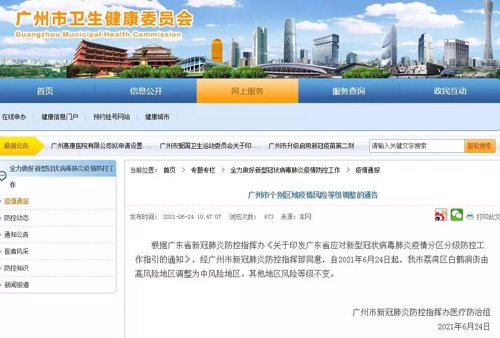 根据广东省新冠肺炎防控指挥办《关于印发广东省应对新型冠状病毒肺炎疫情分区分级防控工作指引的通知》,经广州市新冠肺炎防控指挥部同意,自2021年6月24日起,我市荔湾区白鹤洞街由高风险地区调整为中风险地区。其他地区风险等级不变。