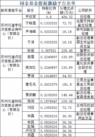 待此次股权转让完成之后,涌金投资持股比例将降至7%,上述三大员工持股平台合计认缴出资金额1818万元,持有国金基金5%的股份。
