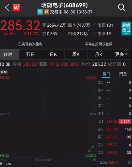 今天开盘,明微电子直接一字涨停20%,最新股价285.32元每股,市值达212亿元。