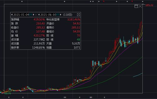 殊不知,今天20%涨停后,明微电子已是今年又一个五倍股。截至6月30日收盘,该股今年从不到55元每股涨至最新285元,涨幅近420%。