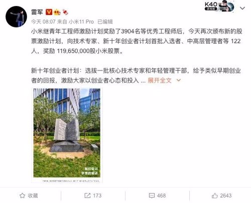 7月6日,小米公司创始人、董事长兼CEO雷军宣布,小米继青年工程师激励计划后,今天再次颁布新的股票激励计划,向技术专家、新十年创业者计划首批入选者、中高层管理者等122人,奖励119650000股小米股票。