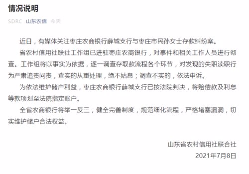 7月8日,山东省农村信用社联合社在其官微发布情况说明称,省农村信用社联社工作组已进驻枣庄农商银行,对事件和相关工作人员进行彻查。工作组将以事实为依据,逐一调查存取款流程各个环节,对发现的失职渎职行为严肃追责问责,查实的从重处理,绝不姑息;调查不实的,依法申诉。