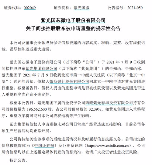 旗下另一家A股上市公司紫光股份也发布了类似的公告。紫光股份称,紫光集团下属全资子公司西藏紫光通信投资有限公司持有公司股份数量为1,328,555,471股,占公司股份总数的46.45%。如紫光集团进入重整程序,重整方案将可能对公司股权结构等产生影响。