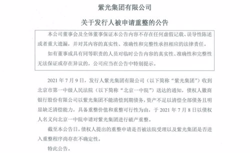 7月9日,紫光集团发布公告称,其收到北京一中院送达的通知,债权人徽商银行以其不能清偿到期债务,资产不足以清偿全部债务且明显缺乏清偿能力,具备重整价值和重整可行性为由,于7月8日以债权人名义向北京一中院申请对紫光集团进行破产重整。