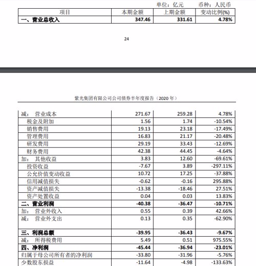 2020年上半年,紫光集团营业总收入347.46亿元,净利润-45.44亿元,分别较2019年同期上涨4.78%、下滑23.01%。