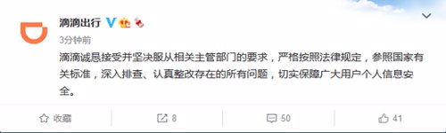 7月10日凌晨,滴滴官方微博发布回应国家网信办关于下架“滴滴企业版”等25款App的消息称:滴滴诚恳接受并坚决服从相关主管部门的要求,严格按照法律规定,参照国家有关标准,深入排查、认真整改存在的所有问题,切实保障广大用户个人信息安全。