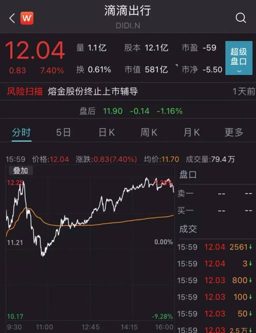 受消息影响,滴滴出行(DIDI.N)高位跳水,由最高涨近9%迅速收窄至3%。截至最新收盘,滴滴出行报12.04美元/股,涨7.40%。