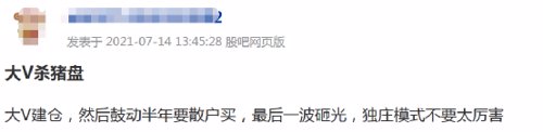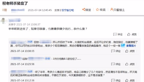 在一条直言“程老师杀猪盘”的贴子下面,有人回复,“半年前就进去了,如果你跟票,也是赚多赚少而已,杀什么猪?”对此发帖人回应称,“吹了半年,有多少人是后面才加的,他自己都是分了几个月建仓,然后清仓不告诉粉丝,昨天砸的时候还告诉粉丝减仓降低成本稳赢,不要在乎波动,今天直接砸跌停,这不是杀猪盘?”