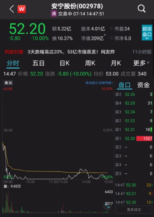 今天开盘仅12分钟,安宁股份就闪崩跌停,随后打开跌停但跌幅一直在9%以上,尾盘该股再次回封跌停板,报52.2元/股。