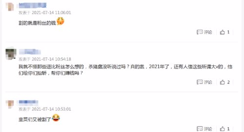 还有一条评论表示,“我就不懂那些逗比粉丝怎么想的,杀猪盘没听说过吗?真的蠢,2021年了,还有人信这些所谓大v的,他们给你们抬轿,帮你们赚钱吗?