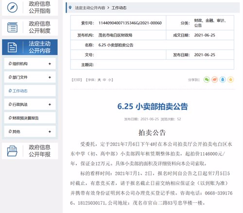 茂名市电白区财政局官网在6月25日公布了一份《小卖部拍卖公告》。这份由广东源通拍卖有限公司出具的拍卖公告显示:受委托,定于2021年7月6日下午4时在本公司拍卖厅公开拍卖电白区水东中学(初、高中部)小卖部四年租赁期整体拍卖,起拍价1146000元/年,保证金12万元。具体小卖部的面积及详细资料向本公司索取。