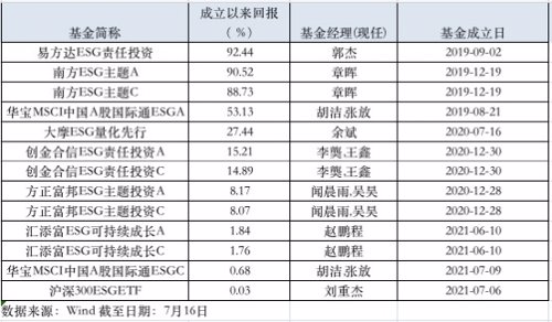 纯ESG主题基金成立于2019年及之后,在已成立的18只纯ESG主题基金中,易方达ESG责任投资、南方ESG主题A、华宝MSCI中国A股国际通ESGA成立以来回报分别高达92.44%、90.52%、53.13%。