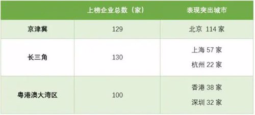 分区域来看,京津冀、长三角和粤港澳大湾区三大城市群的上榜企业分别为129家、130家和100家。