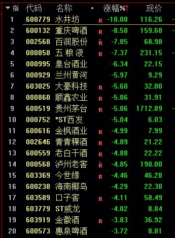 白酒股持续大跌,水井坊跌停,贵州茅台跌超5%向下逼近1700元大关。值得注意的是,水井坊已连续两个交易日跌停。