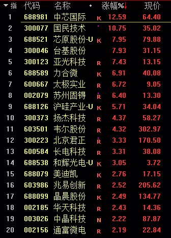 半导体板块早盘掀起涨停潮,5000亿市值芯片一哥中芯国际一度20%涨停,创上市以来最大盘中涨幅。板块个股整体走势偏强,但尾盘受大势影响板块指数持续回落,留下长上影。