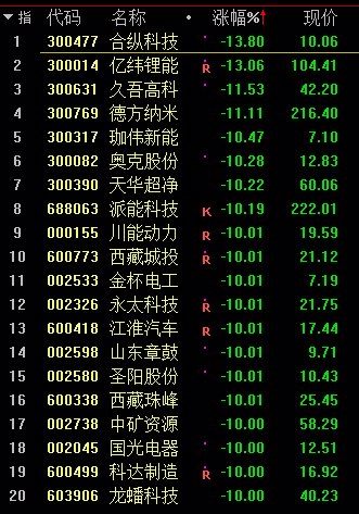之前还是有锂走遍天下,没想到今天就上演跌停潮,亿纬锂能、久吾高科、赣锋锂业、西藏珠峰、西藏城投、中矿资源、江苏国泰等十余股跌停或跌超10%。