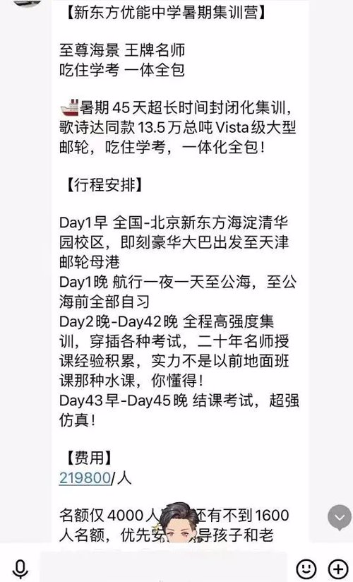 近日,网络上流传一张宣传“新东方优能中学暑期集训营”的微信聊天截图。