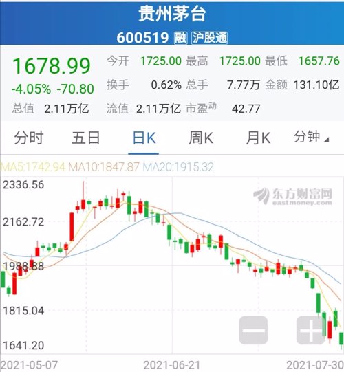 7月30日,茅台报收1678.99元,跌幅4.05%。当天,上证消费80指数报收7261.68点,跌幅2.06%;沪指报收3397.36,跌幅0.42%。年初,茅台股价一度攀至2776.74元的高位。