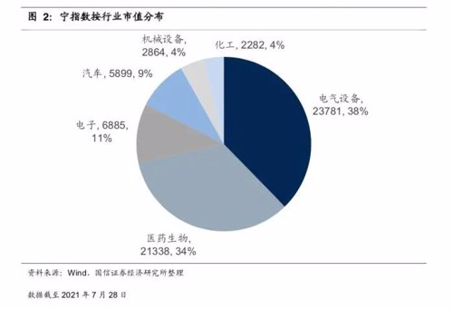 宁指数涉及的行业一共只有6个,市值高度分布在电气设备和医药生物两个行业,其中电气设备行业市值占指数总市值的比重高达 38%(7月28日股价),医药生物占比也有 34%,这两个行业加起来占了指数超过 70%的市值权重。宁指数其他涉及的行业还包括电子(市值占比 11%)、汽车(市 值占比 9%)、机械设备(市值占比 4%)、化工(市值占比 4%)。